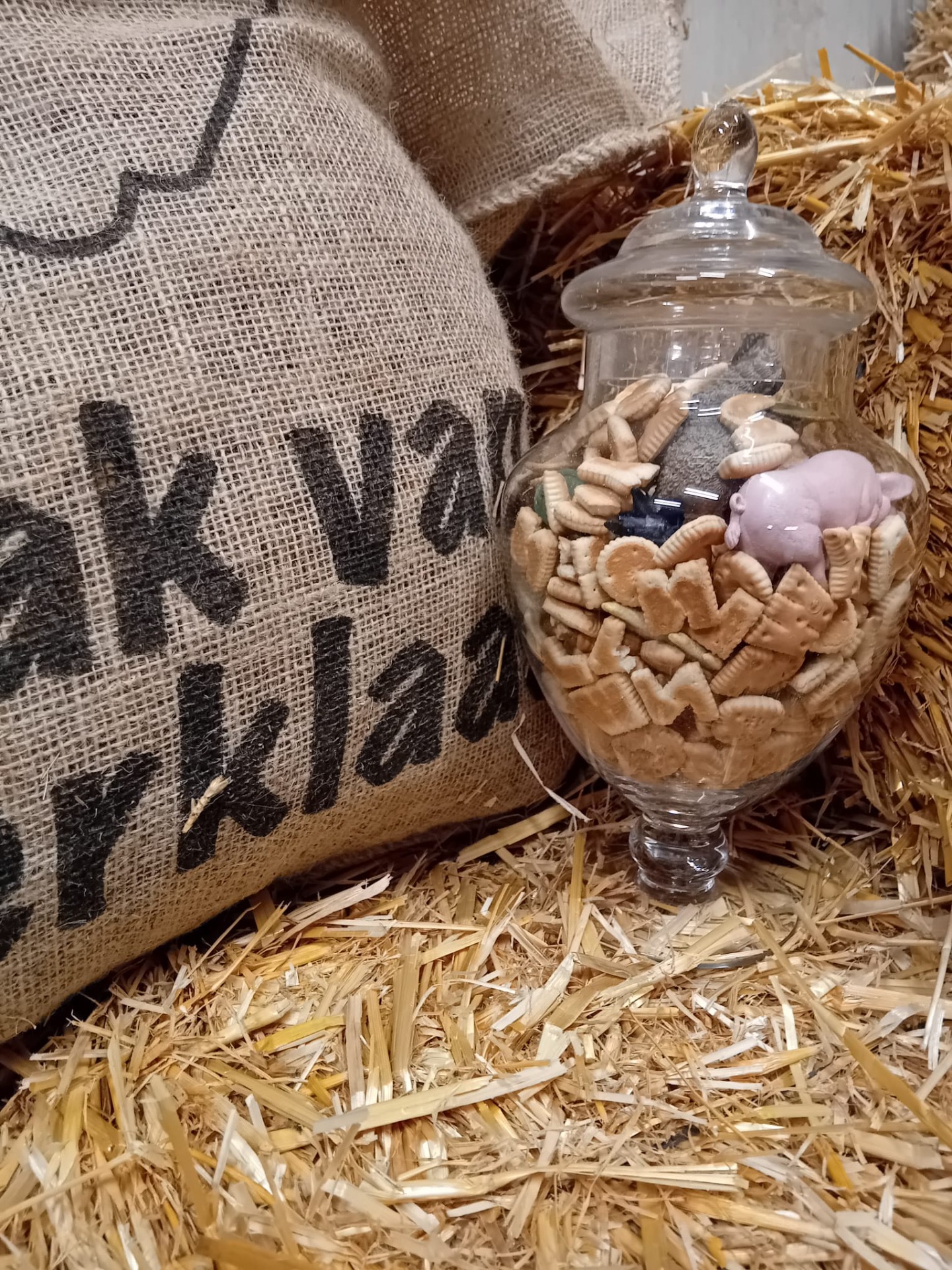 In de koekjespot van Smulpiet zaten 215 letterkoekjes!Smulpiet heeft ons wel willen foppen, want tussen die koekjes zaten ook speelgoeddiertjes verstopt. Of was het misschien toch de verstrooide Piet die zijn speelgoed op een wel héél ongewone plek had opgeruimd?
